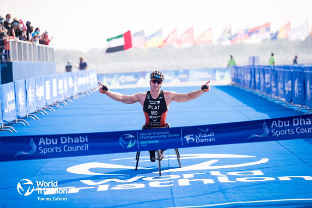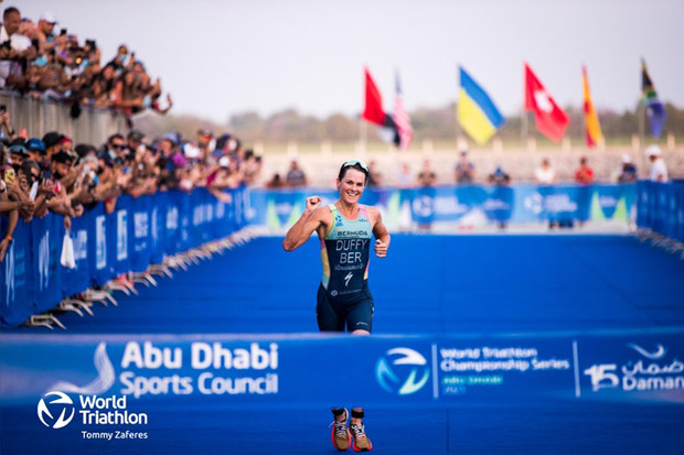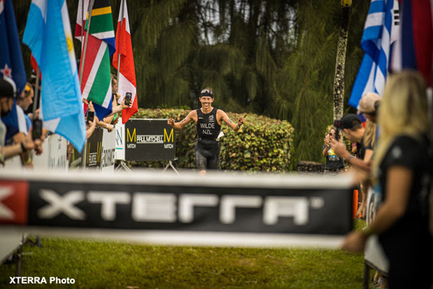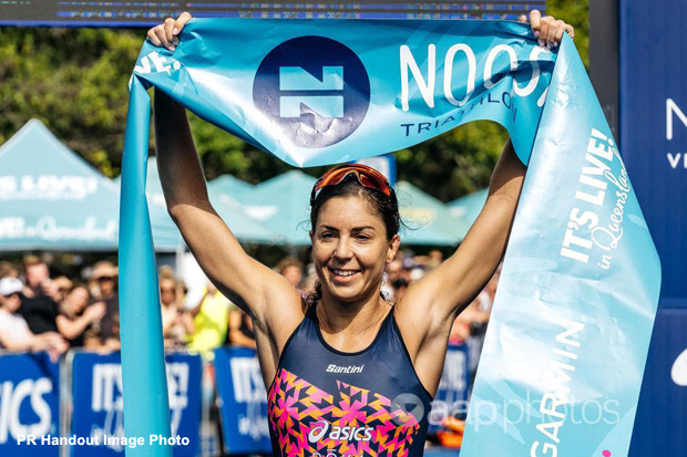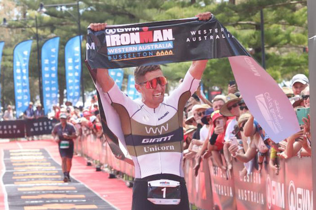Matt Burton posted race-best bike and run splits for 9:11 margin; Kylie Simpson dominated the women's field.