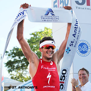 2008 Olympic champion Jan Frodeno of Germany edged Ivan Vasiliev of Russia and Alicia Kaye of the United States outran Nicky Samuels of New Zealand to win the pro titles at St. Anthony’s Triathlon.