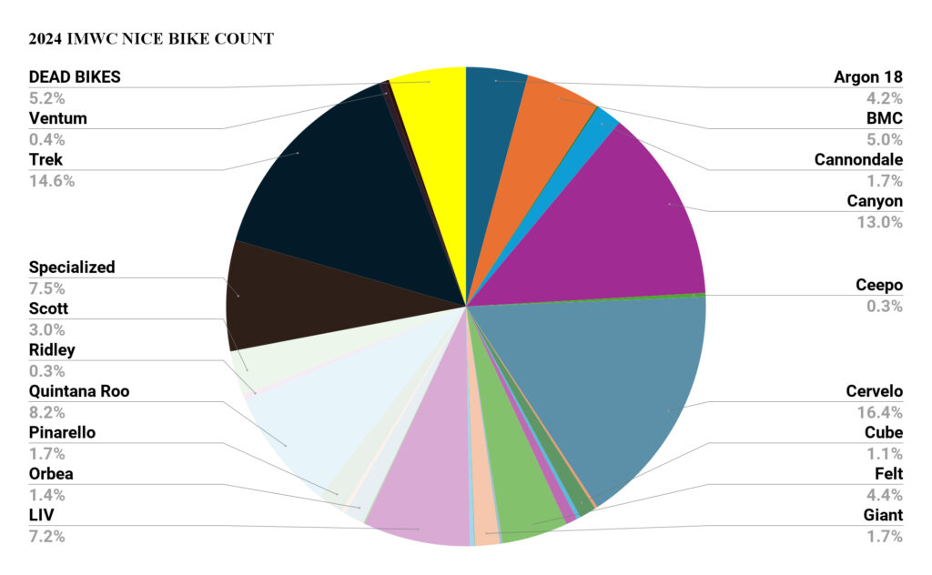 Now, as for removing bike brands — the dead bikes. What is a dead bike, you might ask? They made up about 5.2% of the total bike count at the World Championship in Nice. When looking at how we could do the bike count better, we realized we had to streamline things. Remember: less options = more accurate count. Looking at the data, bikes have the widest variety with 38 options of bike brands on the original count list. We felt that 11 of those shouldn’t be included anymore. Why? These are companies that, although they might still be in business, their focus has changed. TT or triathlon bikes are either not part of their consumer offerings, or they simply don’t focus on it anymore. This saves the counter time and energy, but it also creates a new and important category: dead bikes.