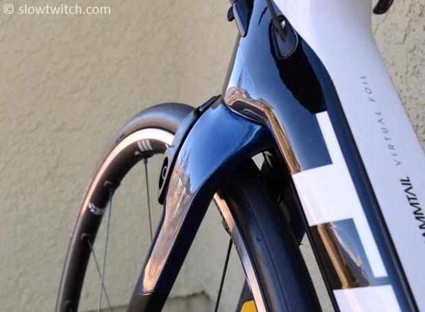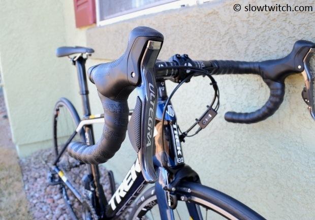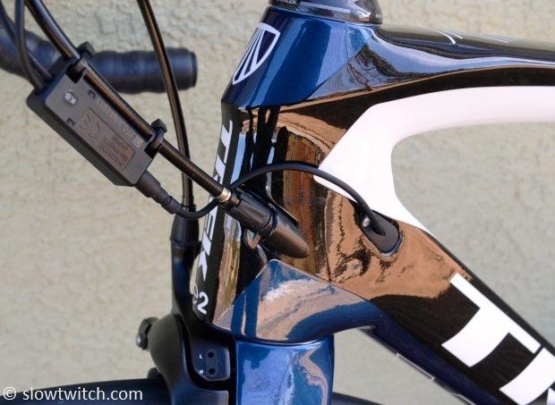 The Di2 junction box and routing are quite clean on the Madone. Also note the tapered head tube – it uses a 1.5” lower bearing, and 1.125” upper.