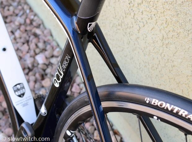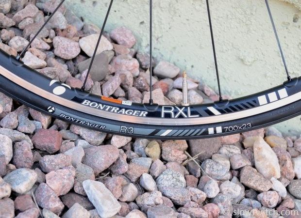 Stock wheels on this bike are the Bontrager Race X Lite. They feature 23mm wide rims and an optional tubeless conversion kit. The stock bikes come with inner tubes and standard (non-tubeless) Bontrager R3 tires: