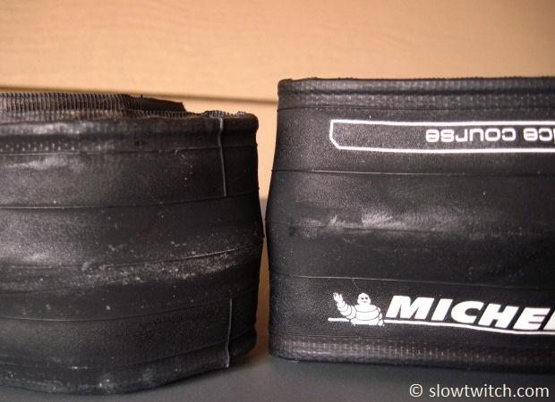 This photo shows the difference between the 23mm version (left) and the ‘25mm’ version (right). The two tires are clearly very different: