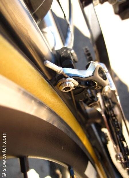 I’ve heard that these tires run large – in the range of 29mm on a narrow rim. On my fat Hed rims, my tires measured a whopping 30.8mm when brand new at 80psi. After a few days, this stretched to a full 31mm. They just fit inside my titanium tri bike. The closest clearance was with the Dura Ace 9000 front derailleur, which had about 2mm to spare: