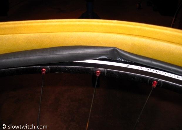 In the above photo, notice how tight the tire’s casing sits against the rim. With so little room to stuff the inner tube, I had to go with a smaller-than-normal size. Rather than a 700×28 tube, I had to use one intended for a skinny 700×20-23 tire.