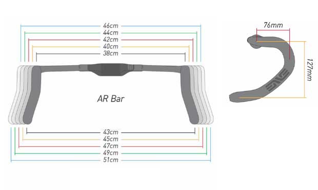 A lot of riders in the peloton – Victor's teammate Giacomo Nizzolo, and Remco Evenepoel of Team Quickstep – are rotating their hoods inward. (Rotating around a vertical axis, rather than slanting the hoods from the vertical plane. Victor does both: his hoods are both rotated inward and slanted from vertical.) Remco rides with hoods rotated inward, but not slanted because he doesn't ride with bars like these. The closest I can find to the bar Victor is aboard is the AR Road handlebar by ENVE (pictures and schematic below). The AR is an aero road handlebar, but it’s got a gravel-like flare. It’s got a hole in the center section, where the stem clamps to it, if you’re routing your hydraulic lines through the stem.