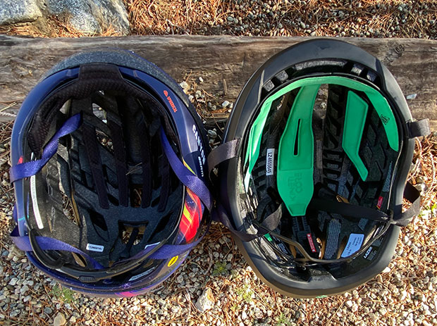The only adjustments most people make in their helmets are the convoluted straps that lead from your helmet to the buckle under your chin; and to tighten/loosen the retention system. That’s either done using a ratchet dial (see that in the back of the Giro helmet above), or in the case of Lazer a thumb wheel on top that resembles a tiny treadmill (also viewable in the image above). Lazer’s retention system is called the Advanced Rollsys System (ARS).