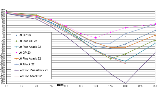 The obvious standout is the dark purple line (Jet+ disc) that dive-bombs on the graph. The pink line just above it is the standard 23mm Jet disc. I inquired as to why that wheel was only tested out to 20 degrees yaw.
