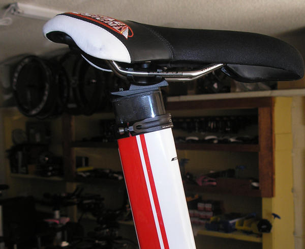 The saddle tilt is effected through this single bolt that tightens everything down, and getting the saddle tilt precisely where I wanted it was a bit laborious. But once I got it there, the bike does a nice job of keeping its saddle put: the saddle did not slide, or tilt, or move in any direction that is unfortunately often the case with tri bikes today.