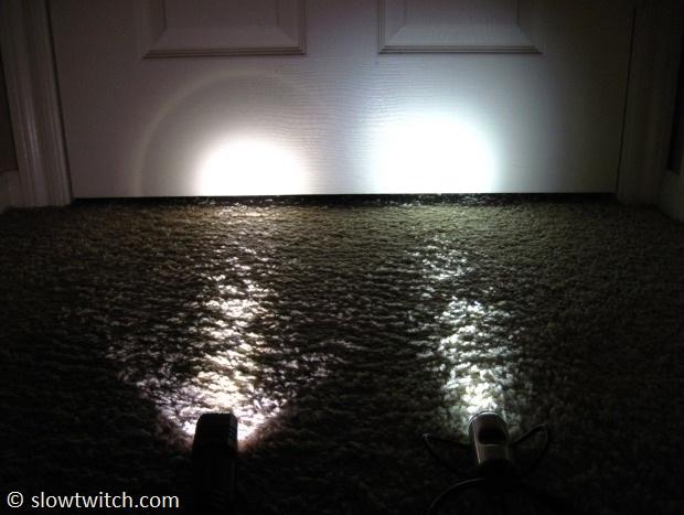 For a better comparison, I pitted the Scorch against my tried-and-true DiNotte 140l. The DiNotte has an external battery pack (and longer run time), but the two should theoretically have the same brightness. The Scorch is on the left; DiNotte 140l on the right: