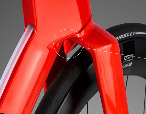 There’s a ton of tire clearance to this bike and wide fork blades (and seat stays) are becoming more the rule than the exception with new tri bike launches. I’m not an aerodynamicist but I play one on the internet. To me, that theme of letting the air flow through the elements of the bikes rather than around the entire frame means the wheel maker is free to make a wheel/tire construct is his or her choice. Take Zipp, for example, that makes its 858 NSW to work specifically best with 28mm tires. I find myself listing tires as imperatives, alongside fit. Just as I won’t buy a bike that doesn’t fit me, I won’t buy a bike (or a wheel) that doesn’t optimize the tires I want to ride. (Which is why so many road bike makers now release products that allow for 30mm and 32mm tires).