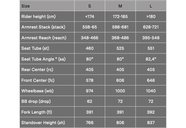 Below is how the bike fits. I love to see symmetric looking charts like this, with some overlap in sizing so that fitters and customers can make decisions not only based on fit but handling (if you can fit aboard more than one size then you make your choice based on handling). Frame stack and reach are not included on the size charts (guys… it’s not that hard to put the necessary metrics on a geometry chart). But I suspect that the frames were built with frame stack and reach as design inputs, as the fit windows of these 3 available frame sizes sit on a gradient.