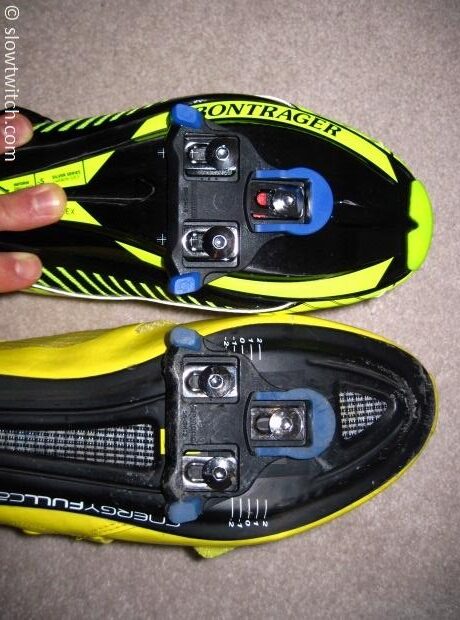 I was able to hit my preferred cleat position, but I had to slam them all the way back. This photo shows the RL (left) compared to the Mavic Tri Helium (right), both with Shimano blue cleats: