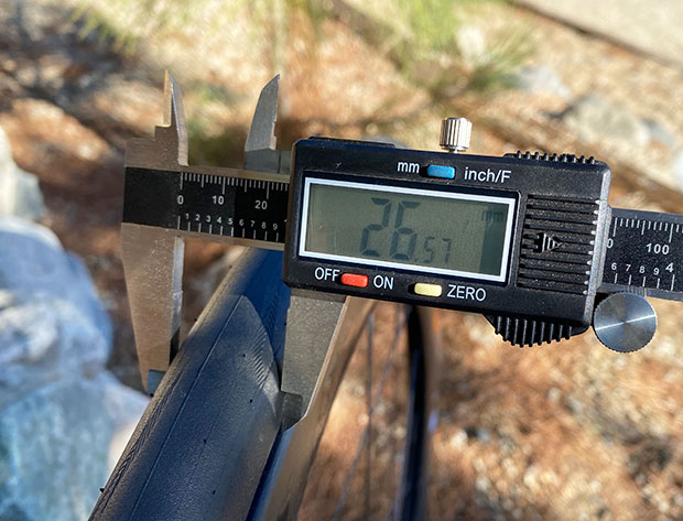 But here’s the thing: The 25mm tires, inflated, are only about 26.5mm wide. If you’re a Rule of 105 adherent the rim is 115% of the tire at their widest points. If you mount a 28mm tire the width of that wheel is, then, about 105% the width of the inflated tire.