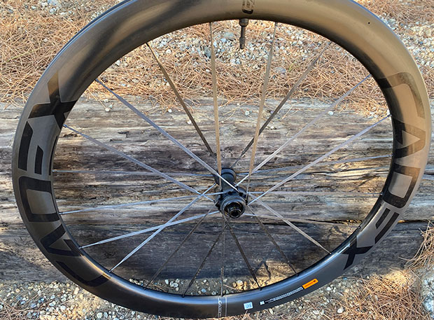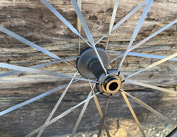 On the front wheel there’s 21 spokes, weird enough, and it’s 7 pairs of 2x spokes on the disc brake side, and 7 straight (no cross) spoked on the drive side. Very rare to see asymmetric spoke counts on a front wheel. This kind of makes sense if you intuit that the wheel needs to be stronger on the rotor side. But you’ll look long and far for a 21-spoke front bicycle wheel. While odd, I have not had a CADEX wheel failure, or a wheel come out of true or round, or a broken spoke. And these are all bladed spokes (though the blades on the 50 Ultra are deeper than on my other CADEX wheels). There’s every reason for these to be flexy wheels, with bladed spokes and 7 spokes on one side, but lateral stiffness is a hallmark of CADEX wheels, throughout the line.