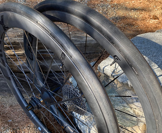 The first is a CADEX AR (All-Road) wheel (the fatter of the 2 wheels above), which is really CADEX’s gravel wheel, and that brand also has some quite nice 40mm gravel tires pretty much made for that wheel. But I prefer to put 32mm CADEX Classics tires on that wheel and that’s what I use if the road features rideable dirt, cracked asphalt and such.