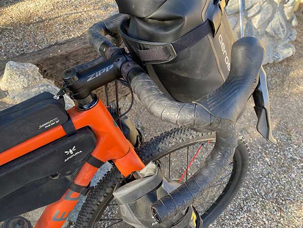 But let’s put to bed something that must be dealt with, and that’s the price. This is a $450 handlebar and that’s too much for just about any road or gravel handlebar. That said, we have a lot of readers here who’ll pop for what it takes to outfit the bike they want and this bar is the ultimate. It's a gravel bar and usually I wouldn’t hesitate to put it on my road bike, but this bar is gravel only and I’ll get to why. It weighs 190 grams in the size I’m riding (42cm). I might put a 40cm on my road bike but on this bikepacker, with a lot of weight on the front, I’m opting for a bar with a bit more control. While very lightweight the bar is strong, largely because of the way CADEX makes their bars, with one continuous mold. No joints. Usually with a carbon bar the hooks are made separately and bonded on. Not so these bars and no joint means weight savings.