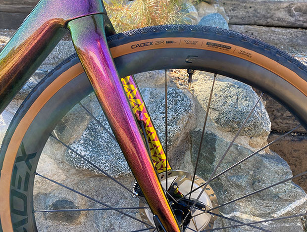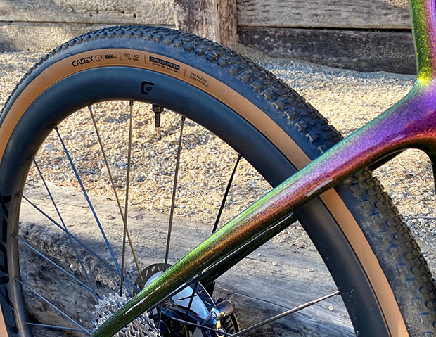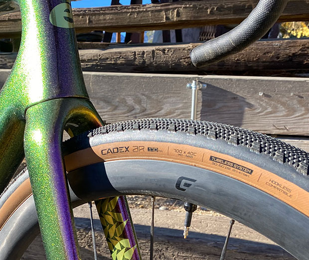 And if I was to take a bike to Unbound Gravel it would be this bike with these wheels and perhaps the AR version of these tires. The finer bead in 40mm, above, is the AR Tubeless Tire, and the tire below is the GX Tubeless. Me? I think they’re both just gravel tires. They’re each 170tpi tires, and the AR tire features, according to CADEX, “Dual Shield bead-to-bead puncture protection combines a proven Race Shield+ layer on the center of the tire with all-new X-Shield on the sidewall.” Sounds like an Unbound tire to me. These are each $85 tires.