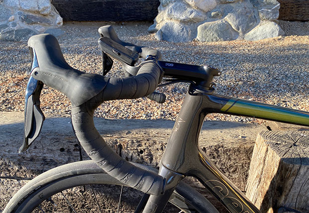 The third metric important to me is flare and in “my day” flare happened on handlebars on funky touring bikes ridden by folks wearing Skid Lid helmets. No. Thank. You. But gravel brought the flared bar back and this bar has 8° of flare. Flare is one reason a 115mm drop works: the flare gets the wrists out of the way of the tops when you’re on the drops. I’m all about flare these days, road or gravel.