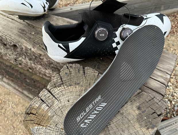 Advertised are “Custom” Solestar® insoles but – in the spirit of “words mean things” – no, they are not custom, as they are not molded to my feet as are my Sidas or Footbalance (actual custom) footbeds. These are production. But they are good footbeds and I have not found the need to replace these with my customs. One last thing about these footbeds. They are structural. I think it's why my feet hurt after that first ride. (But only after the first ride, just as my feet are sore after my first run in a fresh orthotic.)