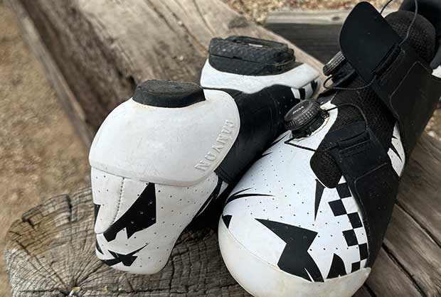 I only have miles in the road shoe and the photos here are not of a pristine shoe. I have about 500 miles in them, pretty hard miles, on the road and on gravel, through driving rain, 1-hour rides and 6-hour rides. (Yes, I should’ve taken my pics before I began riding in this shoe. That… didn’t happen.)