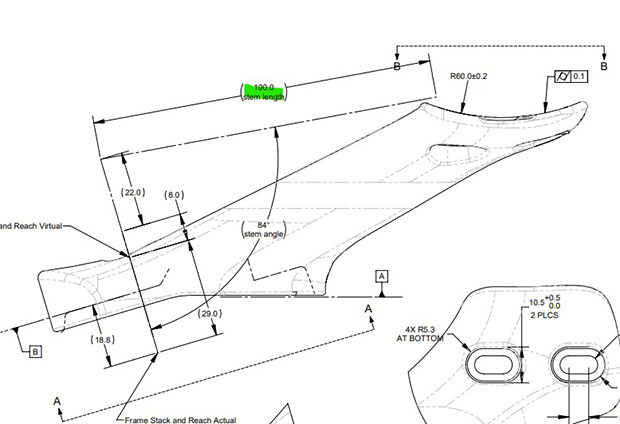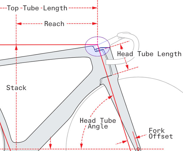 This is an aero superbike, but it’s not got the adjustment limitations of most integrated bar/stem systems. Stems from 80mm to 130mm in 10mm increments are available, with 30mm of stack. There’s only one set of bolts affixing the stem to the frame rather than increasingly longer bolts as the handlebar stack grew taller (which was the case in the model just prior). Because of the architecture of this handlebar, the frame appears long and low and you would expect the stack and reach numbers to be off-kilter versus what we're used to. But if you look at where Cervelo measures stack and reach (in the schematic just below) it’s not at the typical place. Stack is measured pretty much in line with the top of the top tube and that’s where stack is normally measured, in practice, because the top of the head tube is near the top of the top tube. On this bike, the top of the head tube is several centimeters below the top of the top tube, and the steep upward angle of the stem that goes on this bike compensates for the very low head tube top. Got it?