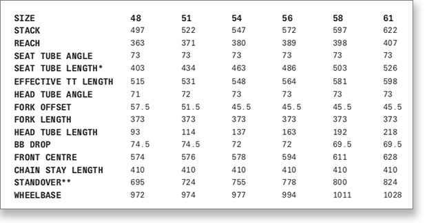 In size-54cm and up the geometry is what we call a “parallel 73”, meaning the seat and head angles are each 73°. This is very standard, very traditional road. This is this bike’s geometry from 54cm to 61cm, and the sizes from 51cm and down have shallower head angles, for the reason discussed just above.