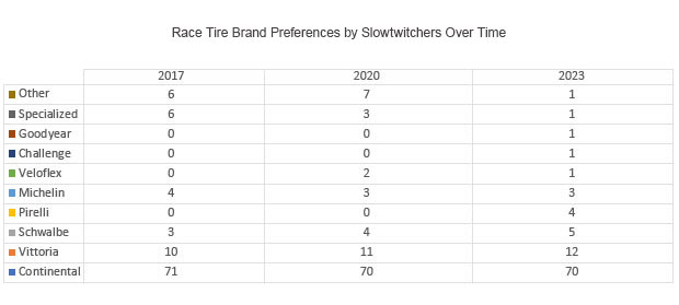 There's an even chance I'm getting canceled now on social media for my impolitic or, in this case, politic figure of speech, but edgy jokes aside can we agree on the striking brand attachment between Slowtwitchers and Continental? Not just in market share, but in the miraculous durability of the number: Seventy percent. Not sixty-seven. Not seventy-three. Seventy percent of you will race on Continental tires; and in 3 polls over 6 years it’s been exactly that number or percentage points from it.