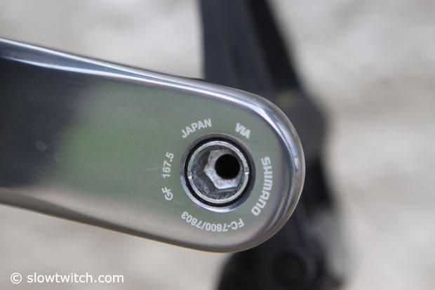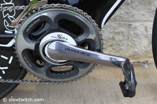 Shimano Dura-Ace cranks with an SRM power meter and Shimano pedals.