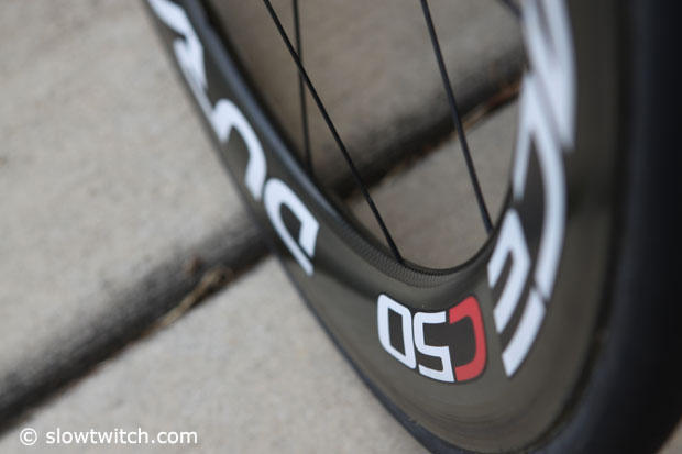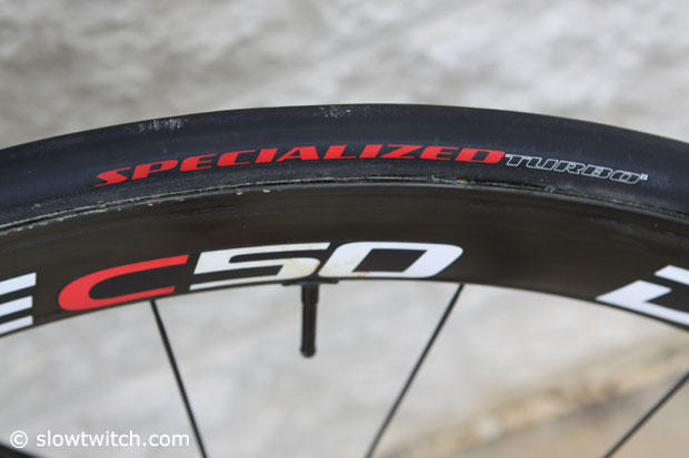 Specialized Turbo tires front and back, and a Shimano Dura-Ace C50 wheel up front.