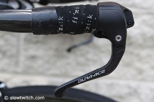Shimano Dura-Ace brake levers and a tiny bit of Fizik bar tape.