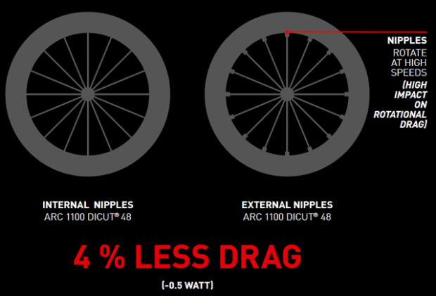 DT Swiss also designs for their spoke nipples to be hidden inside of the rim, claiming a 4% reduction in drag, for the 25% of drag made up by rotation. I suspect that this will remain an area of debate between lab data and bike mechanics, with external nipples resulting in easier service (and some competing wheel companies claiming that there isn’t a significant aero cost). I’ll leave it to you to decide what’s more important.