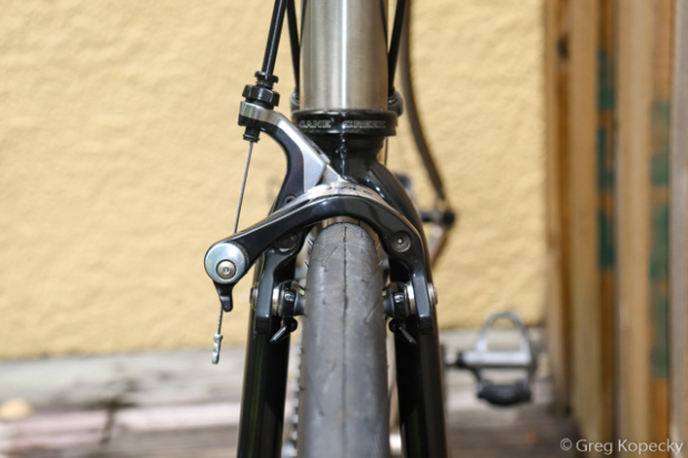 I mounted up the wheels, and noticed that the front tire was quite close to the inside of the front brake. Upon initial inflation, the 25mm Schwalbe Pro Ones measured 26.4mm, and after about two weeks they came in at 26.9mm. My fork is a cheap steel replacement from QBP’s Dimension brand, and was advertised as clearing 28mm tires. It will clear 28mm tires – without a brake on.