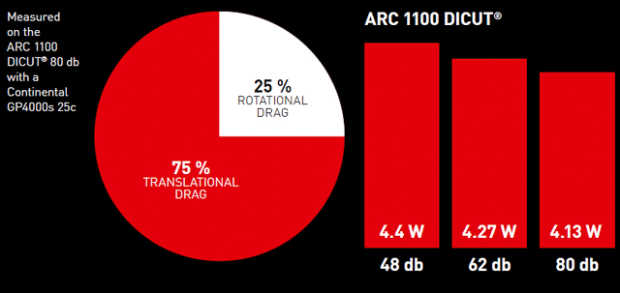 Wheels are subject to both translational drag (caused by your wheels moving forward through space) and rotational drag (caused by the spinning of the wheel / spokes churning up the air). DT’s data says that this pans out to a 75:25% split for translational-to-rotational. As expected, deeper rims result in lower rotational drag, because the spokes are shorter (causing less churning of the air).