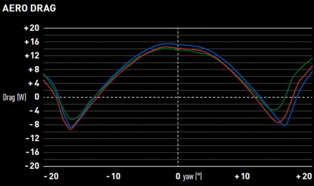 What does all of this aero tech add up to? First, we’ll look at the three wheels in the ARC 1100 DICUT line (above). The lightest line represents the 48mm rim depth, the middle line represents the 62mm rim depth, and the darkest line represents the 80mm rim depth. Tests were performed at the GST wind tunnel in Immenstaad, Germany, using the 23mm Continental GP 4000 S at 45kph.