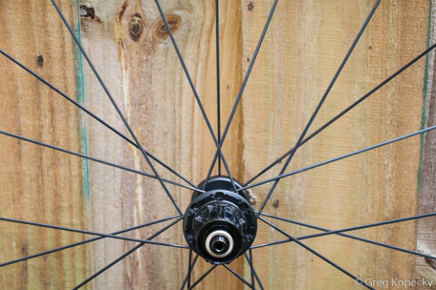 My 62mm rim brake version features 16 front spokes and 21 rear spokes – with the rear wheel laced 2:1 (i.e. there are two drive-side spokes for every one non-drive spoke). I’ve come to like this style of lacing because it greatly evens out spoke tension compared to traditional lacing patterns.