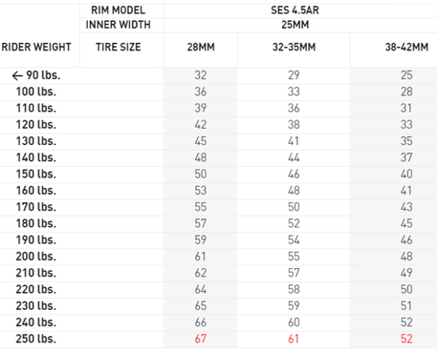 Next, we’ll cover the topic of tire pressure, which is where things get interesting. The above chart shows ENVE’s recommended pressures for the AR series, based on the tire size and rider weight. At first glance, these pressures might appear to be quite low – and they are for old-school road riders.