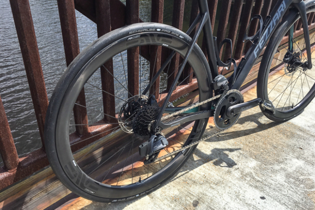 I rode the SES AR 3.4 wheels as part of a the Empire endurance road bike from Fezzari. The wheels came set up in advance from Fezzari with ENVE tubeless rim tape, and about 35ml of Stan’s NoTubes sealant per tire. Tubeless tire/rim fit is always a concern for us, so I removed and reinstalled one tire to see how this combination panned out: