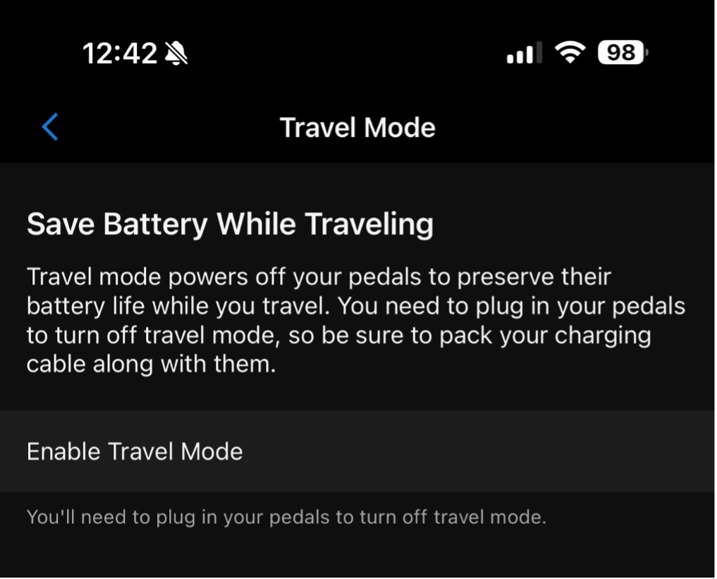 Another unique feature worth noting is Travel Mode. It powers the pedals down, so they are “offline” while you’re flying or packing your bike. They wake back up once you plug them in to charge, which is required to bring them back to life. This feature is helpful for avoiding phantom battery drain and keeping them safe in transit. Just don’t forget your charging clips!