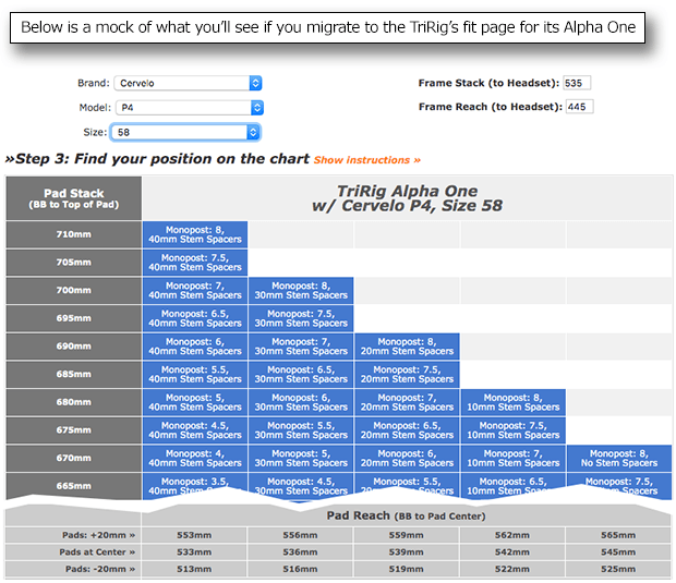 This is not new – Slowtwitch has covered this before. But it really is the best part of the aerobar, for both a bike fitter and an athlete with an established fit. Choose your frame, enter the size, (do this here) and this is the way you build a bike from the bars back. The Alpha One solution is prescribed – Monopost height, stem spacer height, pad position fore and aft. The chart lists all the fit possibilities, the ranges of fits the bar can meet while you dial in your fit over the course of a season perhaps.