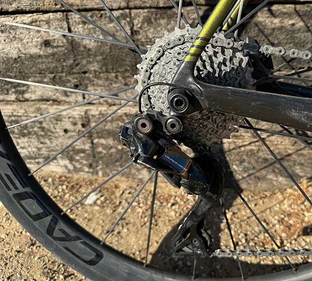 My SRAM bike has an even smaller gear: 33t ring and 36t small cog (SRAM’s 10-36 cassette below). Riders today spin up even the 24 percent grades they see in the Vuelta. Everything can be ridden at cadence.