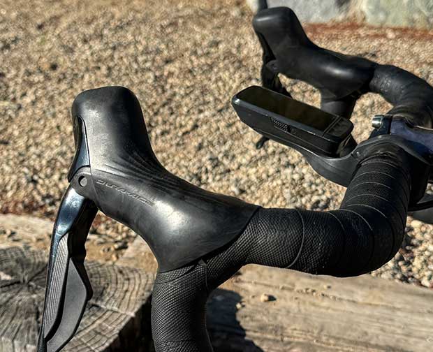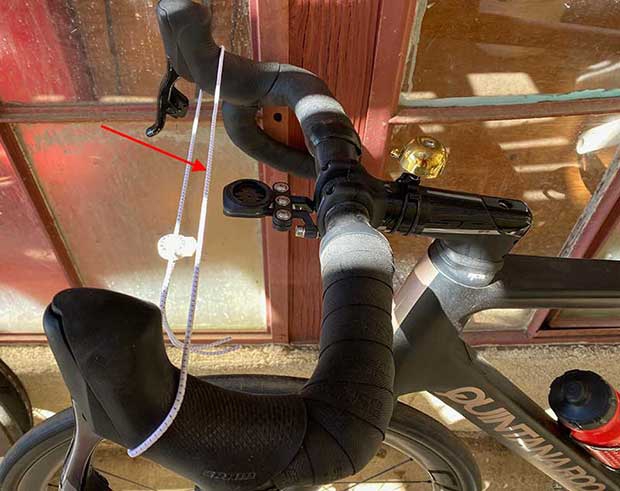 While other riders might not be riding Pogacar tight in their cockpits I don’t believe handlebars are moving forward the same distance that saddles are moving forward. In fact, while saddles are coming forward a centimeter or two – or three – I don’t think handlebars are moving forward at all. I base this on how much of the hood the riders are grabbing as they’re riding. In particular on seated climbs. In my own case, my Web X measurement remains 600mm, which it has been for many years. To measure Web X, you note where the web of your hand meets the pommel of the hood. Web X is the “run” – the horizontal distance – between the BB and the midpoint between the pommels of each hood. I place a lace lock over my hoods, run a plumb line through the BB, and measure from that plumb forward to the centerline of the lace lock.
