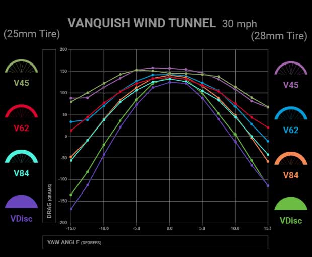 The Vanquish line includes depths of 45mm, 62mm, 84mm and disc. These are referred to as the V45, V62, V84 and VDisc, with the latter 2 only available in the Pro trim. The V45 and V62 in the Pro trim just have the word Pro as a suffix, as in, V45 Pro. The V84, which is only available in the Pro trim, is sometimes called by folks inside of HED the V8 because in the prior (2017) Vanquish update this depth was known as the V8.