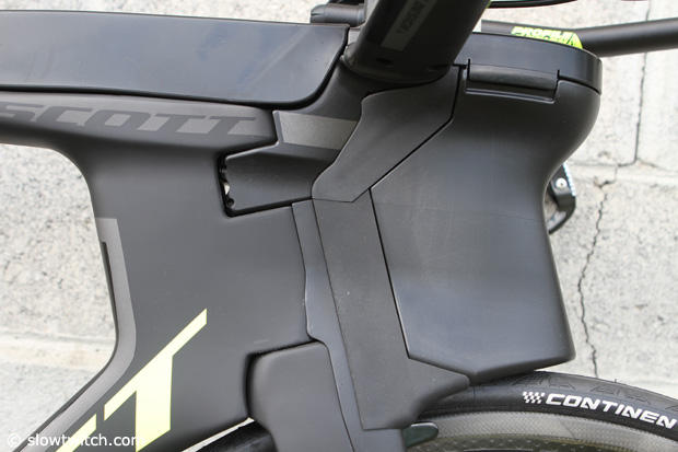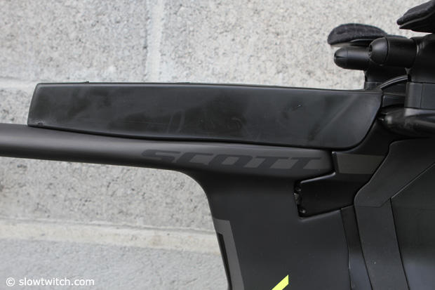 Up close and personal with the integrated front end of the Scott Plasma 5 Tri. Scott worked with Profile Design on the cockpit and the storage solutions. As we said, the integrated bottle can easily be removed if you do shorter distance or do UCU events.
