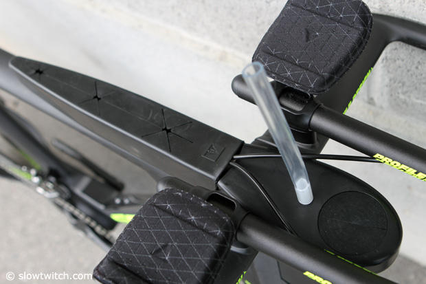 The view from above shows the water fill spot and where you can store gels etc. The top tube storage unit can also be divided inside, that is something Kienle suggested. The bars and extensions are new too and according to Profile Design will come to their product line soon too.