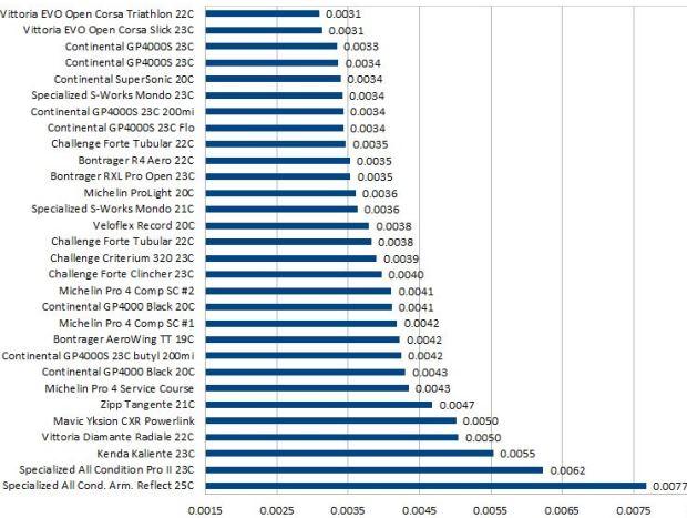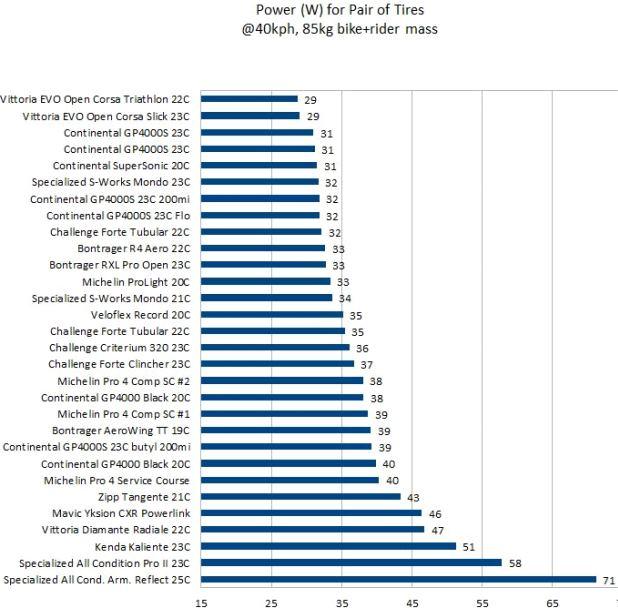 Tom tested both tires individually (hence tire #1 and tire #2). The tire width was measured on a 15c Mavic Open Pro rim (internal width of 15mm). He then lists the official Coefficient of Rolling Resistance (Crr), and then the power required to spin a pair of tires at 40kph. Like golf, lower is better.