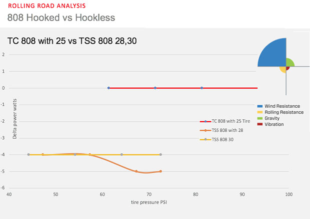 What you’ll see in the chart above is that a 200lb rider will not be able to put enough pressure in a 25mm tire to hit optimal performance. What we say here on Slowtwitch is that hookless may well be a superior tech for tubeless road, but at 28mm tires and larger. This, until the ETRTO agrees – and perhaps the tech evolves – so that 25mm tires are safely used with this tech at pressures above 5 bar.