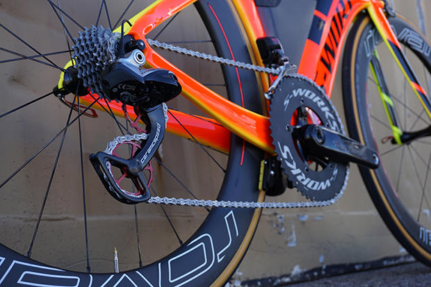 Tim Don has the CeramicSpeed OSPS pulley system and the CeramicSpeed UFO chain connected to his Shimano Dura-Ace Di2 components. The names of his kids are engraved on the pulleys.