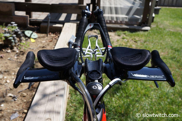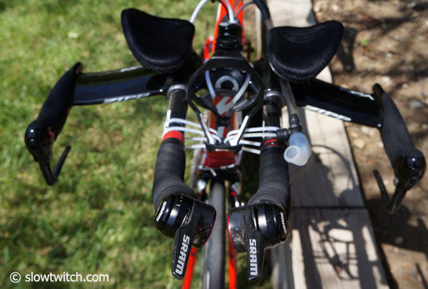 Zipp VukkaAerobase bars with Zipp ski bend extensions and Jordan Rapp's custom rigged between the bars hydration setup.