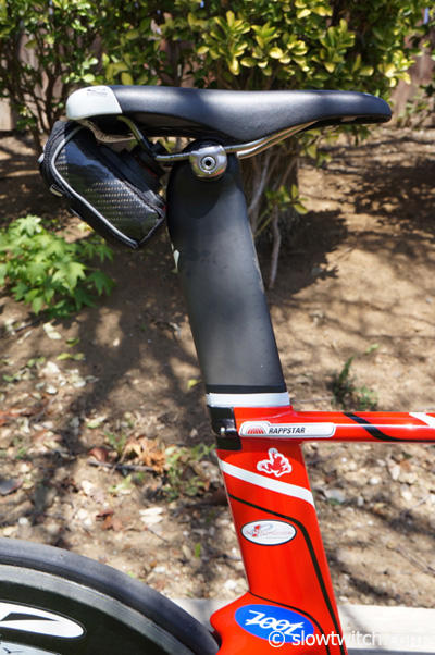The SciCon Phantom260 saddle bag tucks nicely under the Cobb SHC170 saddle, but for racing Jordan uses a SciCon Compact 430