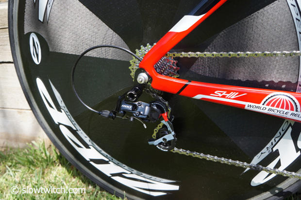 A Zipp Super9 disc in the back with SRAM Red Black derailleurs looking very stealthy.